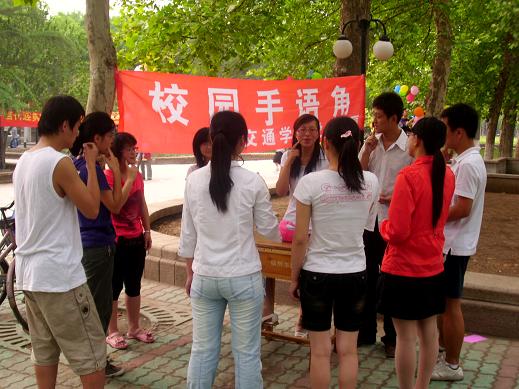 活动由会长宋维同主持,在他做完简短的开场白之后,活动正式开始。首先,副会长唐琳琳和王丽娟负责对来自各个公司富有爱心的同学们展开培训,她们主要向同学们传授日常用语,像“你好”、“你叫什么名字”、“谢谢”、“对不起”等等,经过不厌其烦的教导和指正后,同学们每每用自己的双手打出一个刚刚学会且准确无误的手语时,笑容就会溢满在她们和同学们的脸上。其次,同学们展开角逐,每当唐琳琳说出一个日常用语时,他们就抢着用刚学会的手语表达出来,虽然还不是很娴熟,但还是可以看出他们心情的无比激动。