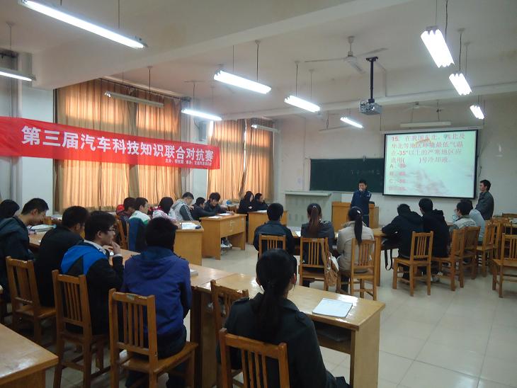 为了更好的传播汽车文化,加强员工对汽车知识的了解,由体育外网十大平台app校社联主办,交通汽车俱乐部承办的“汽车科技知识联合对抗赛决赛”于12月7号晚7:00在12号教学楼211教室举行。汽车俱乐部本着一切从同学利益出发的原则,为大家开展了这次对抗赛。此次比赛以公平公正的原则,让同学们把所掌握的知识充分发挥和展现出来。进入这次决赛的共有六个小组。活动场面气氛活跃,竞争激烈。