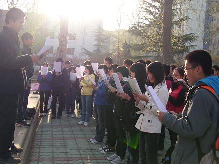 本学期的“疯狂晨读365”活动采取疯狂英语集训营的高强度操练模式。社团为晨读活动确立了晨读誓词:“Let our voice be heard through the campus!”与口号:“Conquer English to make China stronger!”每次正式晨读之前同学们会集体大声喊出口号和誓言,以此来激励、鼓舞大家。社团负责人首先把同学们分成“Crazy team”和“Dream hunter”两个阅读小分队,之后,社团将会在两分队间举行题为“口语比拼”的大赛来督促并激励全体队员,检验大家的晨读效果。此外,为让同学们积极投入其中,社团还为两分队授予了队旗,鼓励大家用激情与汗水来捍卫队伍的荣誉。