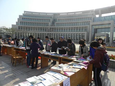 上午九点,活动正式开始。活动现场分为借阅区和捐书区。借书区整齐摆放文学、历史、教育、医学、杂志等各类书籍。同学们可以在现场免费借阅自己喜欢的书籍,免费借取同时在随书小册上写下随感。漂流交友所借图书可以在每周日下午2点至4点到图书馆书店漂流角还书,以便书籍可以继续漂流。捐书区,同学们可以拿出自己喜欢的书,写上漂书寄语后与有缘人分享信任与快乐。零下三度的冰冷没有阻挡住同学们积极加入活动的热情。同学们高兴的拿书来,满意的抱书归,传递书籍更传递信任与友情。人群之中还看到了