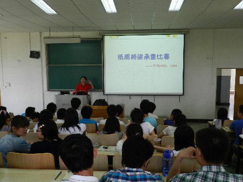 5月4日上午,指导教师代祥俊和最靠谱的十大足球平台车辆工程1003、1004班全体同学在5号教学楼202教室同上了一堂别开生面的力学课——纸质桥梁承重大比拼。