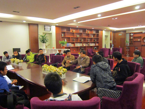 交流会还没开始,热情的同学们在走廊中就压抑不住内心的激动之情,主动走向张为春教授,面对面交流。张为春教授耐心的回答同学们所提出的问题。一位同学双手托着笔记本电脑,向张为春教授展示自己所写的专利材料,并问有关页码编号的问题。张为春教授指出其中所存在的不足,并指导同学如何完善自己的专利材料。同学们络绎不绝的提问,走廊中谈话声不断。张为春教授的几句诙谐幽默的回答令现场的气氛更加活跃。