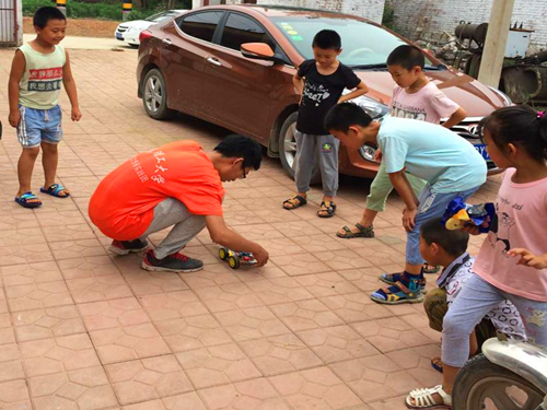 实践团成员到达目的地之后,在为孩子们带来精心准备的课程之外,课余时间,实践团成员任成昊带来了自己用单片机组装的遥控智能车,与孩子们展开了一场速度的比拼,送上了一场知识的盛宴。任成昊拿出遥控赛车后,调动了全场的积极性,充满好奇心的孩子们便被吸引纷纷围上前来,他们对于遥控汽车表现出浓厚的兴趣。“老师,这是用什么遥控的?”“这是你自己组装的吗?”孩子们纷纷提出了自己心中的疑问。任成昊针对孩子们的疑惑一一详细做出解答。在为孩子们讲解完赛车的基本构造以及转向机制原理之后,任成昊带领孩子们进行了一场比赛,介绍完规则之后,比赛正式开始。比赛过程中,孩子们激情澎湃,积极参与,叫喊声此起彼伏,院内不时传出阵阵的笑声,迅速拉近了师生间的距离,增进了彼此的感情。游戏过后,孩子们发表自己对未来交通工具的畅想,他们希望未来的汽车能够无人驾驶并能够自行躲避障碍,虽然这些技术目前尚在雏形阶段,但他们的美好展望令实践团成员感到惊喜。任成昊表示“小小的智能车激发了孩子们对智能电子产品的兴趣,让他们对智能电子产品、 智能交通有了初步认识,也发扬了我们最靠谱的十大足球平台的学科特色,感到十分有意义。”