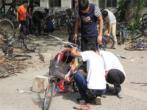 伴随夏日清晨的凉风,车辆1604班的15名同学来到了机交实验楼的西侧,进行公共自行车的维修活动。王倩首先对此次活动做了简单的介绍,她讲到此次活动的目的是将废旧自行车重新组装、维修,使废旧自行车可以重新使用,同时她希望同学们认真负责,积极地投入到维修改装公共自行车的活动中,在保证质量的前提下,尽可能的提高效率。随后,王智远对参加此次活动的人员进行分组分工,详细的布置了参与人员的任务,保证维修活动高效率的进行。随后,各组同学开始紧张有序的公共自行车维修活动。同学们干劲十足,全神贯注,任务分配合理有序,每一位同学都积极地投入到公共自行车的维修中。他们表示,在公共自行车的维修中,最严重的的问题就是零件腐蚀严重,拆卸组装费劲,为此每位同学都积极商量想对策,默契配合,凝聚力十足。