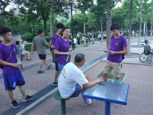 下午6时,实践团准时到达石村。队员们首先检查各项娱乐设施的可使用性以及多样性,发现一些老锈的器材存在极大的安全隐患。随着居民们陆续地来到便民广场,队员们相继进行了调查问卷发放、现场采访等既定内容。队员们在观察中发现社区健身器材少且老旧、棋桌没能充分发挥作用、广场舞占据所有文化活动的半壁江山;通过调查问卷了解到文化活动单一且经久不变等。