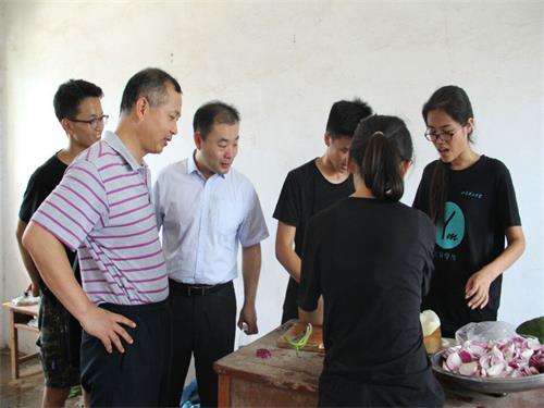 在参观完实践队员的宿舍以及厨房之后,由该天需要做饭的队员在厨房准备午饭,王建兴等人在办公室里与实践队员进行了亲切的交谈。王建兴首先赞扬了实践队员不怕苦,不怕累的精神,对实践团所开展的工作给予了高度的肯定。随后王建兴感叹当地教学条件的艰苦,课桌板凳已经用了数年,房屋破旧,甚至好几个教室都漏雨,这种地方正是需要国家来扶持帮助的。在经过一番交谈后,实践队员和老师的关系顿时拉近了许多。