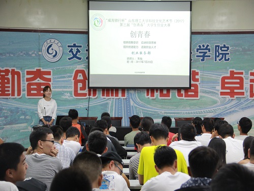 朱灿从老员工竞赛概况出发,先简单介绍了“创青春”挑战杯的有关信息,让同学们对其有一个初步的了解。然后详细介绍了校赛的情况,鼓励同学们积极参加,锻炼自己的能力。为了提高同学们对这个比赛的热情,朱灿以视频的方式向同学们展示了往届的一些优秀作品以及成果,成功引起了同学们的热切关注,大家都看得很认真,时不时伴随着掌声。朱灿讲得很具体,一些细节方面更是强调多遍,避免遗漏。随后,她解决了困惑同学们很久的问题:为什么要参加比赛。她说大学就是给自己不断尝试机会的一个舞台,什么能做,什么做不了,只有做了才能知道。然后以14级的一个学长的亲身经历为例,鼓励大家勇于尝试,以风趣的话语,和大家面对面交流,并用采访该学长的一个视频,告诉大家,只要肯努力,没有什么是不可能实现的。最后,朱灿还详细说了参加比赛的时间和流程,整个巡讲会在热烈的鼓掌声中结束了。