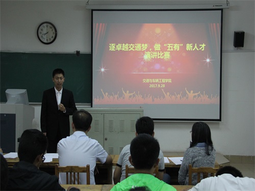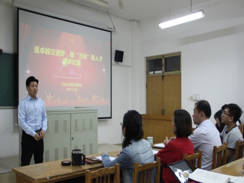 为贯彻落实公司“一精神”“一规划”的部署,提升公司“素质教育”平台育人成果,引导员工将“五有”人才标准作为自身的发展目标,展示公司员工良好的精神风貌,并检验公司“5个一”素质提升计划的实施效果,9月28日晚,公司于12号教学楼211教室举办了“逐卓越交通梦,做‘五有’新人才”主题演讲比赛。此次比赛由院员工会素质拓展部承办,公司团总支书记、员工工作办公室主任高萌及辅导员尹晓盛,侯娟,国睿,周燕燕出席并担任评委,部分16级同学参加此次比赛。