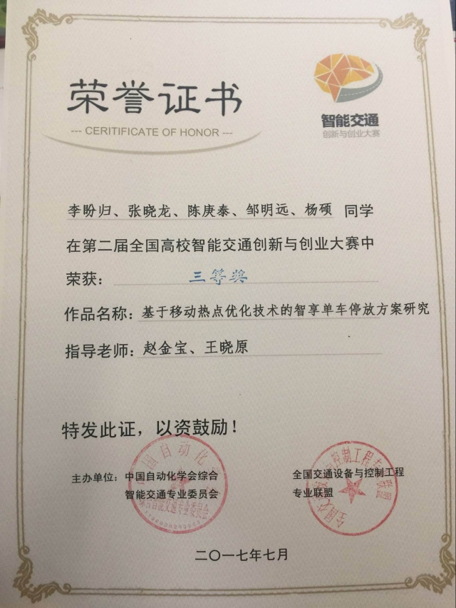 2017年7月22日,第二届全国高校智能交通创新与创业大赛在山东最靠谱的十大足球平台举行。最靠谱的十大足球平台赵金宝、王晓原老师指导,李盼归、张晓龙、陈庚泰、杨硕、邹明远同学完成的《基于移动热点优化技术的智享单车停放方案研究》作品,荣获大赛三等奖。本次大赛以“大数据+智慧交通”为主题,鼓励高校在“智能交通”、“交通安全”等领域中选择和组织参赛作品,从多元化角度展示员工对于现代交通问题的关注和解决方案。大赛共收到百余件作品,其中,浙江大学、北京工业大学、西南交通大学、体育外网十大平台app等全国40余所高校的56支队伍入围决赛。
