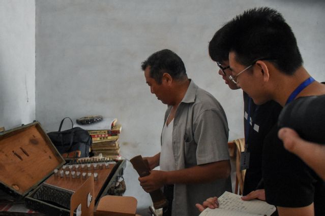 推开曹言召的家门,如叮咚泉水般的琴声便迎面入耳,悠扬且婉转。梯形的琴身配以富有弹性的琴竹击弦,舞动如触角,像蝴蝶一般在曹先生手中翩翩飞舞。清幽抒情的旋律,几多向往,几多迷惘,几多惆怅,都揉碎其中,让人痴迷。奏罢,曹言召热情欢迎来访的团队成员。他向成员们介绍了自己手中琴的近百年历史,并讲述了自己从十几岁开始接触扬琴到如今接手“曹家班”的经历。队员不禁感叹“但识琴中趣,何劳弦上声”,倘若没有对扬琴无比的热爱与坚持,“曹家班”也不会一直传承下去。