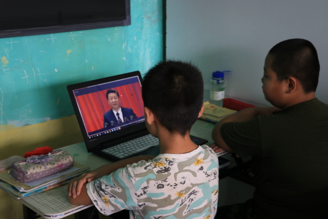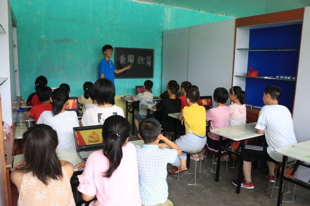 活动开始,队员薛畅向同学们介绍什么是爱国主义教育以及开展爱国主义教育活动的重要性。“爱国主义是中国梦的基石,做爱国主义的坚守者和传播者,始终把国家富强、民族振兴、人民幸福作为努力方向,自觉使个人成功的果实结在爱国主义这棵常青树上。”通过播放习近平主席在北京大学师生座谈会上的讲话,员工们对爱国主义有了进一步的了解。随后,支教队员向员工讲述建国史,通过展示图片为同学讲解可歌可泣的爱国英雄故事,带领员工们唱爱国主义歌曲。“我们是共产主义接班人,迎着革命先辈的光荣传统,爱祖国,爱人民。”童声虽稚嫩但坚定有力,同学们也都热情高涨。