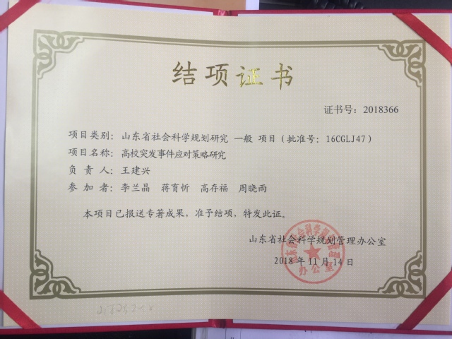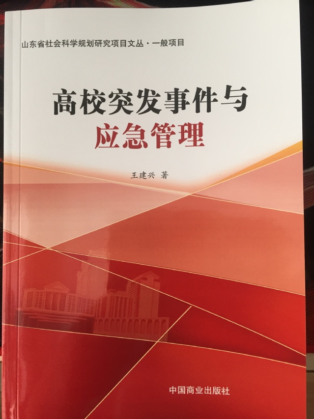 日前,公司教师王建兴承担的山东省社科规划项目:高校突发事件应对策略研究(16CGLJ47)顺利结项。该项目为2016年度立项的山东省社会科学规划研究一般项目,为期2年,项目经费2万元。项目组成员还包括辅导员李兰晶、蒋育忻、高存福和研究生周晓雨。结项形式为2018年7月中国商业出版社出版的学术专著《高校突发事件与应急管理》,计24万字。