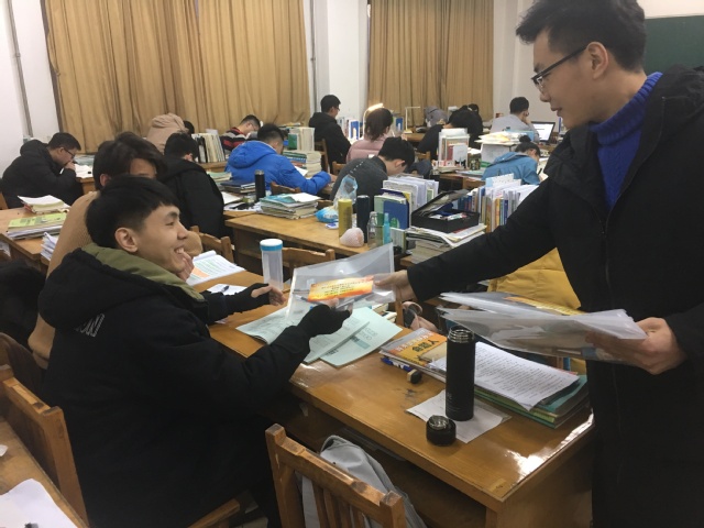 下午5时,2015级辅导员走进公司各个考研自习室,为考研学子发放“考研大礼包”,给他们加油鼓气,嘱咐他们以积极向上,乐观自信的心态迎接考试。“大礼包”为每名考研学子特别定制,印有他们的姓名和祝福语,里面装着签字笔、涂卡笔、橡皮等考试文具。随后,公司研究生党支部党员结合自己当年的考研经历,同考研学子们分享了自己的经验感悟,为同学们提出三点建议:第一,要树立必胜的信念,有坚持到底的意志;第二,要调整心态,保持乐观,不必给自己过度施加压力;第三,最后几天要把作息时间调整到和考研当天一致,劳逸结合,科学备考。党支部党员还为考研学子发放了“党员服务卡”,在上面留下了自己的联系方式,以便随时为考研学子提供帮助与支持。