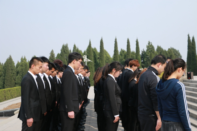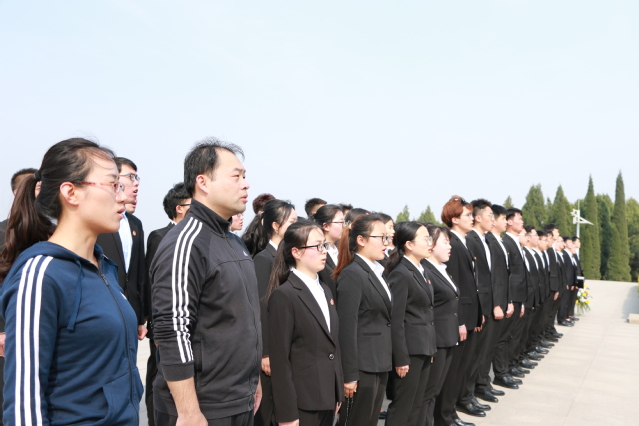 全体成员于烈士纪念碑前列队集合,怀着对先烈的敬仰与缅怀,全体肃立,齐唱国歌,气势如虹。全体师生集体向烈士默哀一分钟,以表对革命先烈的敬畏与缅怀之情。在烈士纪念碑前,在迎风飘扬的团旗下,两位员工代表于纪念碑前向烈士们敬献花篮。青年员工代表寇玉颖向全体成员做主题演讲,她讲到,现在的生活是无数先烈抛头颅洒热血,用生命的代价换来的,作为新时代青年学子,应继承先烈遗志,为建设社会主义现代化强国而奋斗。