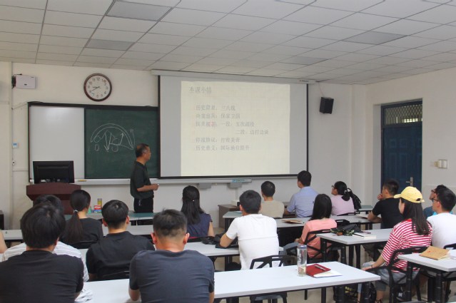 王建兴首先介绍了抗美援朝战争前的朝鲜半岛局势及“三八线”的由来,在美国飞机多次入侵中国领空后,中国人民志愿军为保家卫国赴朝参战;随后,他介绍了抗美援朝的两个阶段:“五次战役”和“边打边谈”,并分析了各阶段采取的战略方式以及取得的成果;最后,在五万万中国同胞的共同努力下,抗美援朝战争取得了胜利,涌现出无数像黄继光、邱少云这样的英雄。“打的一拳开,免得百拳来”,抗美援朝战争打出了中国的国际地位,创造了中国日后稳定的发展环境。