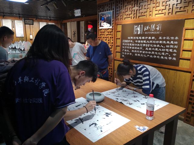 实践团队全体成员首先去到了城中的汝阳刘毛笔馆。此馆是河南省非物质文化遗产,而汝阳刘毛笔至今也已有2200多年历史,被誉为‘中国毛笔文化活化石’。在馆长的介绍下,大家了解到了汝阳刘毛笔在制作时选料之讲究,工艺之繁琐,其不仅具有使用价值,而且观赏和收藏价值也极强。它之所以流传至今,和传承者们的坚持传承密不可分。随后,成员们认真学习汝阳刘毛笔的传承发展历程,并亲自用汝阳刘毛笔书写,感受它精致的魅力。