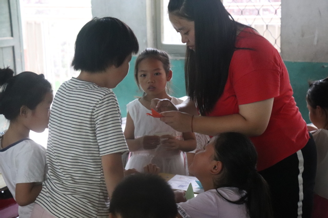 上午,孩子们上了特色课堂的第一课——体育课。伴着清晨和煦的阳光,孩子们模仿老师的动作进行热身活动。随后实践团成员带领孩子们在公司操场跑步,以充沛的活力开启崭新的一天。美术课上,老师教授孩子们画简笔画,孩子们兴趣高涨,充分发挥自己的想象力进行创作。折纸课上,孩子们学习了百合花、爱心的折叠方法,每人叠了一个给爸爸妈妈的爱心,表达出自己对父母的爱;音乐课上,孩子们伴着电子琴进行了合唱,同学们表现积极,趣味颇高。