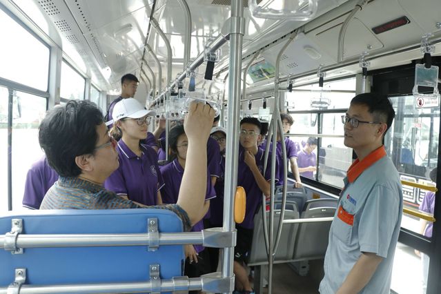 随后,车企技术人员带领团队成员们一一参观车企现有的新能源汽车类型。中通新能源客车电池选用磷酸铁锂电池、氢燃料电池或是纯电动等,其中,氢燃料电池燃料燃烧后不外排,而是集中回收。对于自主研发的平地版新能源汽车电池存放位置问题,技术人员解释到:“平地版新能源汽车电池采用后置或顶置的方法,并且该新能源汽车在雨水积蓄小于五百毫米时可在雨水中浸泡二十四小时,积水小于三百毫米时可低速运行。”