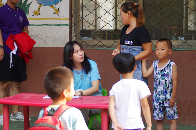 团队分为两个小组,一组在公司负责员工报名统计,另一组负责到刘庄村宣传爱心支教活动。招生活动开始前一晚,团队召开了全体会议,对接下来的工作做出了详细安排,并完成了教师分配任务。经过村委会与团队的积极宣传,村民们陆续前来咨询相关信息,员工在家长的陪同下前来报名。报名过程中,队员按照流程对家长及员工的姓名、联系方式等基本信息进行登记。家长向队员咨询了有关支教的问题,包括上下课时间、教学科目等,队员们对家长提出的问题一一做出详细解答,让家长们对支教活动有一定的了解,报名现场络绎不绝。为保障员工上下学的安全,团队要求在支教过程中,孩子由家长接送,以防止意外发生。