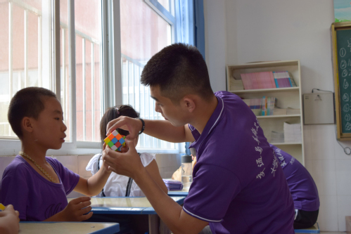 支教志愿者在给孩子们示范动作,指导孩子们学习技巧之后,紧接着布置课堂任务,由于将魔方全部拼好相对比较困难,因此志愿者们让孩子们自己独立完成魔方单独一面的拼凑。