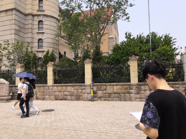 下午1点半,调研队成员到达了青岛天主教堂。天主教堂是一座尖顶楼,拥有着悠久的历史,本名天主教青岛教区浙江路圣弥厄尔教堂,从外面看起来非常的壮观。调研团队通过对当地居民和游客的采访了解了天主教堂的相关知识,包括它的设计人、建造时间,高度以及建筑风格,天主教堂由德国设计师毕露哈依依据哥德式和罗马式建筑风格而设计,始建于1932年,于1934年竣工,塔身高56米。