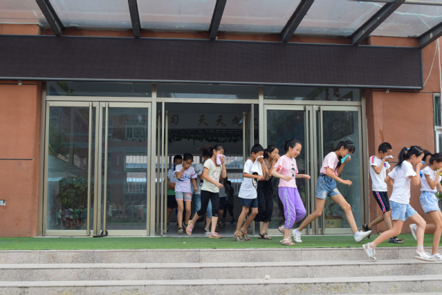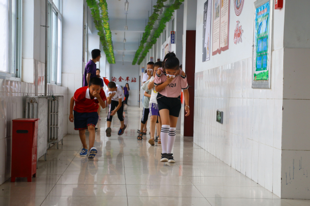 孩子们在听到哨声后按照指导老师教的规定动作低头从教室中盘跑出来,支教志愿者们在旁边指导,同时保护孩子们的安全。