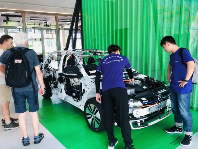 为进一步探寻大众汽车在新能源汽车技术上的造诣,我们又来到了新能源大众Golf展厅,这里展出了一辆去掉车身外壳的大众高尔夫,车身内部的线路、电机组和车架构造一览无余,在这里我们与汽车工程师进行了对话,在他的指导下我们对照说明图认识了各部分的功能和用途。