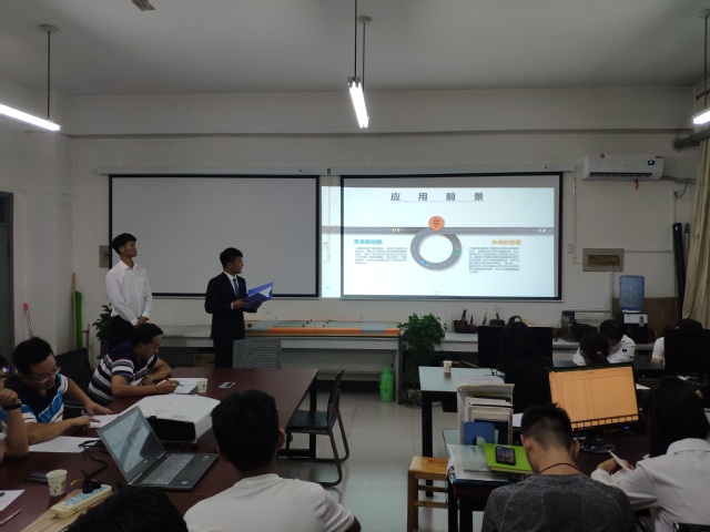进入决赛答辩的小组一共14组,共分四个参赛方向:交通运输与管理、交通信息工程及控制、载运工具运输工程、道路与轨道工程及其他。每个小组派出一名或者两名成员进行答辩,大家按照之前的抽签顺序依次上台进行PPT讲解,讲解结束后,由三位评委老师提问,然后三位老师根据答辩人的表现与作品质量进行评分。