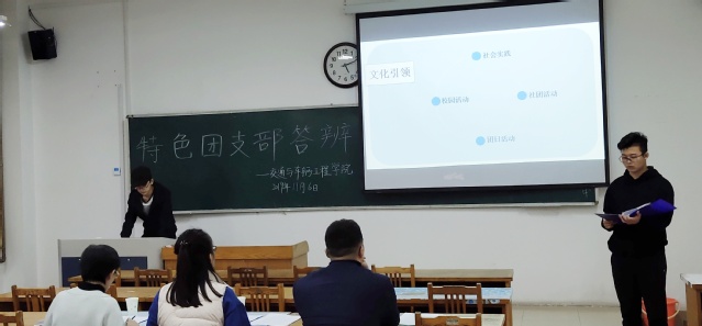 首先由车辆1703团支部代表率先答辩,他们首先讲解了本团支部创建背景、创建过程以及班旗、班训的确定,又从思想、文化、科创、学风等方面展示自己团支部的面貌。车辆1703团支部重点全面阐述了思想引领学业发展、文化主推学业发展、科创促进学业发展、学风保障学业发展四个方面,从团支部整体的进步以及个体同学的进步展示了自己团支部的成功的学业发展成果。最后也表达了本团支部以后的发展计划以及最终目标。