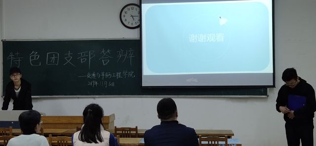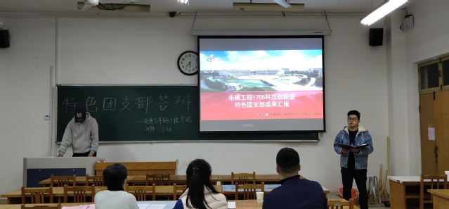 紧接着,是车辆1706团支部代表的答辩。他们先是列举了团支部同学们在科创、团支部建设方面取得的成绩,展示了班级中的“八项计划”、“四项承诺”,介绍了团支部举办过的特色团日活动,并对团支部未来进行展望:继续努力争做“五有”人才。