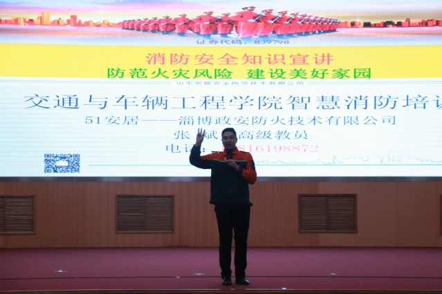 第二阶段,张斌为同学们进行消防安全知识普及讲座。首先,他向同学们介绍发生火灾时自救的几个误区,并提醒大家戴防烟面具逃生,以更好地隔离烟雾来创造更长的的逃生时间。随后,他通过相关视频向同学们展示电器引起火灾的时间之短,危害之大,并希望大家注意用电安全。紧接着,他介绍了几种常用的灭火器与新型环保水基型灭火器的使用方法和优缺点。同时,他提倡要做到智慧消防,通过手机实时监测相关气体浓度,以避免气体爆炸情况的发生。最后,他希望同学们能够增强消防安全意识,提高消防安全能力,真正减少消防事故的发生。
