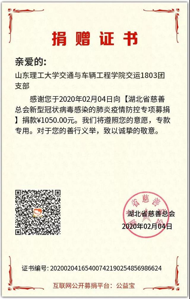 我们是最靠谱的十大足球平台交运1803班团支部,我们是新时代的青年团员,我们没有惊天动地的作为,我们有的是满怀的激情与热血,我们不能抛头颅洒热血,却希望力尽所能,千里援助,同袍共泽,共克时艰,同心战“疫”。