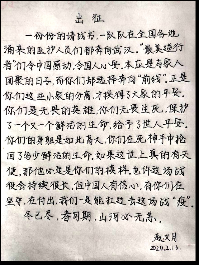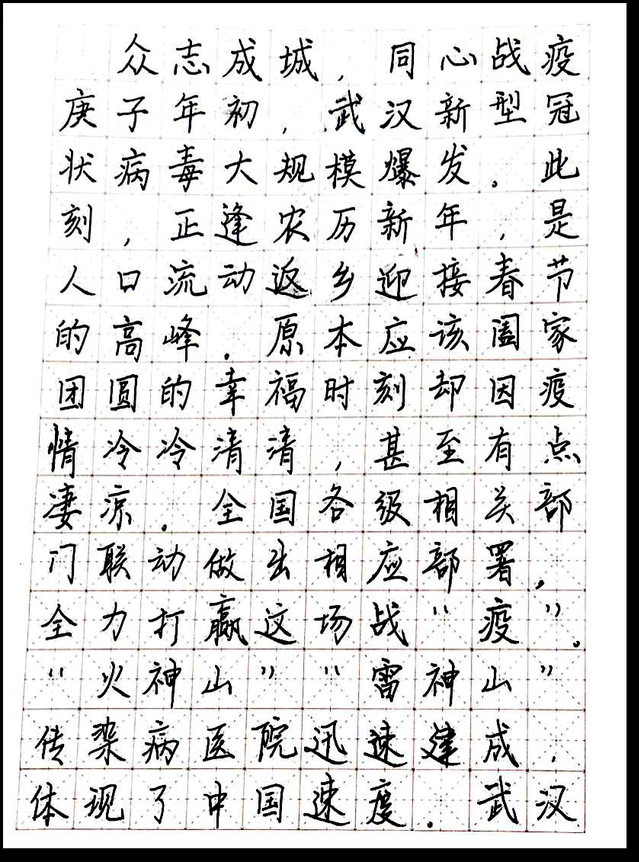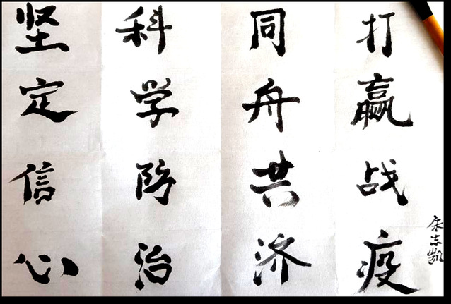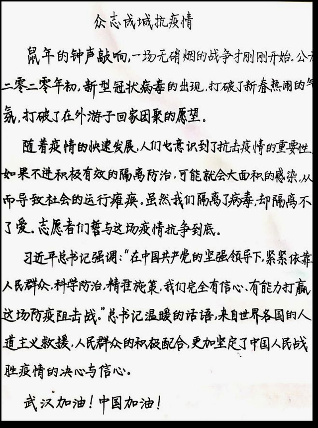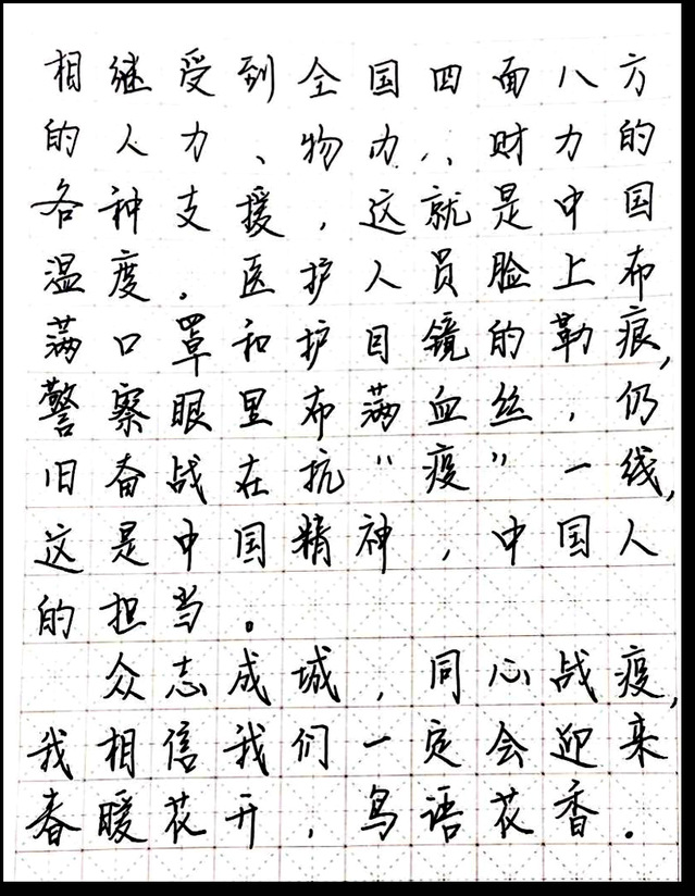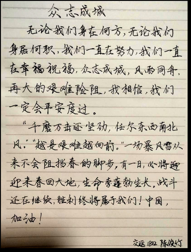 此次线上书法比赛面向公司17、18、19级同学,同学们踊跃报名参加。在此次比赛中,同学们纷纷表达自己对于抗击疫情的态度,为打赢这场疫情防控战贡献自己的力量。不论是用毛笔、钢笔还是中性笔,字里行间都可以看出同学满怀的激情与热血和与子同袍、同心战“疫”的决心。本次比赛共收到76件作品,经过评选,最终评选一等奖3名,二等奖5名,三等奖7名。以下是部分获奖作品: