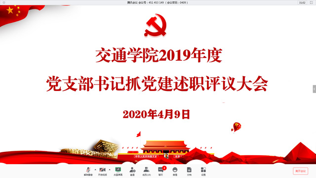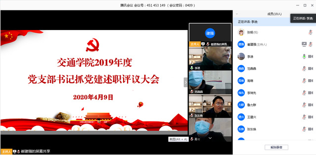4月9日上午,交通与车辆工程公司党总支通过线上会议的形式召开2019年度党支部书记抓党建述职评议会。公司领导班子成员,党总支委员,各党支部书记参加,评议会由公司党总支副书记王建兴主持。