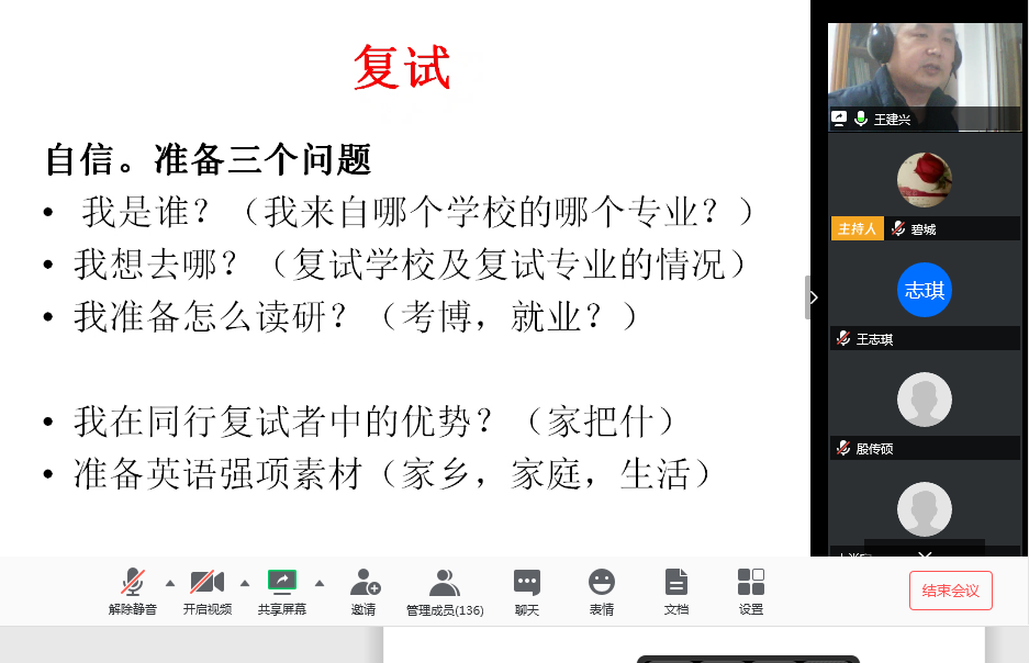 针对考研复试过程中的问题,各位老师与同学们进行了在线答疑。同学们对老师的悉心指导表示感谢,并表示将全力以赴应对下一阶段的任务,不负老师所望。