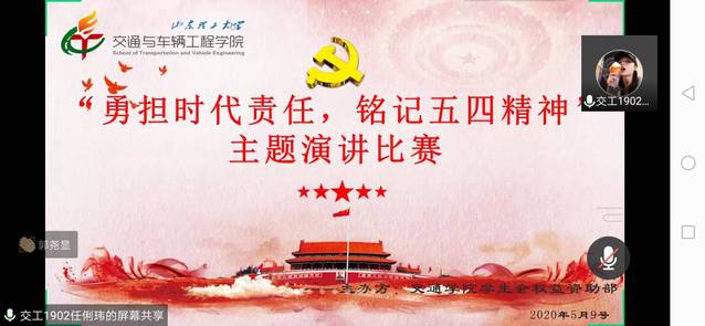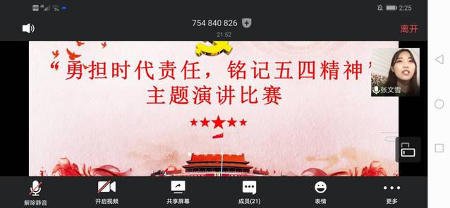 比赛正式开始,每名参赛选手首先打开视频展示自己的面貌并自我介绍,之后开始各自的演讲。参赛选手精神面貌良好,语言流畅,演讲内容贴合“五四”主题,精彩丰富。参赛选手表示,作为时代新青年,会铭记历史,努力成长为勇担时代重任的有志青年。