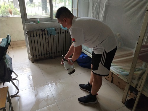 在各班级负责人和宿舍网格员、舍长带领下,各宿舍成员有序进行宿舍及公共区域的卫生大扫除,重点清理了阳台、洗手间等卫生死角,杜绝杂物乱堆乱放现象,保证宿舍干净整洁,要求在日常生活中,垃圾及时清理,不留卫生隐患。在宿舍清理完毕后,由各专业负责人统一到8号、9号公寓楼下管理员处借用喷洒设备并领取消毒液,对所负责的班级宿舍进行全面地消毒,各班级负责人分工合作,密切配合,确保将消毒工作落到实处。最后,为提高同学们的安全意识,各班级负责人对所负责宿舍进行了安全隐患排查,重点检查宿舍内有无存放和使用大功率违章电器,有无存放酒精等易燃易爆物品等,所有违章物品一律交到楼下管理员处存放,对于不合格宿舍要求其在限期内进行整改。疫情防控无小事,为了使返校同学具有良好的生活环境,公司提倡全体员工按时、严格进行体温线上+线下“三测三报”,外出戴口罩,保持宿舍整洁,勤开窗通风,定时消毒。