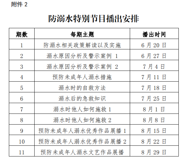 山东省公司安全研究与教育基地、山东教育电视台现已制作《同心防溺水特别节目》,山东教育卫视每周六晚 19:32 播放(播出安排见附件 2),或者通过扫描“安全学习在线”二维码(附件 1),进入微信公众号“安全学习在线”,在“同心防溺水”中打开“防溺水特别节目”观看。节目内容涉及《中华人民共和国安全生产法》《山东省公司安全条例》等相关法律法规的解读、防溺水自护知识专家讲座、各地各校先进经验或工作亮点展示和分享、溺水现场救援警示系列片及互动答题等。请各团支部认真组织收看,营造浓厚防溺水宣传教育氛围,推进防溺水工作入脑、入心。