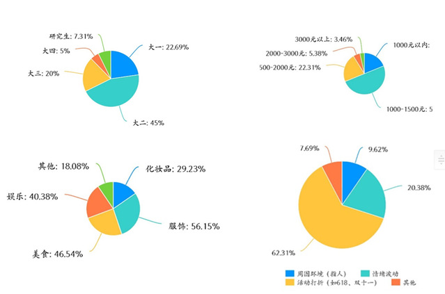 根据研究显示我们所调查的员工中45%都是大二的员工,每个月的生活费在1000-1500元左右,在活动期间(618、双十一)的时候,员工很冲动性购买的可能性比较大。通过调查问卷的结果统计,我们对老员工冲动性购买有了一定的了解,希望在后面的调研工作中可以取得巨大的进步。