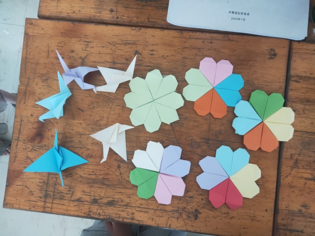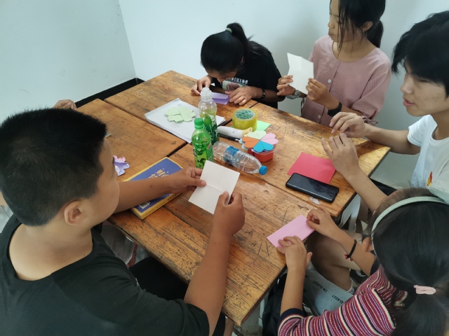 上午为手工课,具体活动有折纸,剪纸和制作泥塑。老师提前准备若干彩纸,保证每一位同学同时拥有五张不同颜色的彩纸,另外准备了三种折纸方式用于教学,即四叶草,百合花,棒棒糖,每位老师负责一个年级,手把手教学,而员工们可以随便挑选这三种方式之一。每个组的员工们都兴致勃勃的开始了此次折纸之旅,在这样的模式下,员工们能够清晰地看到折纸的步骤,及时跟上老师的节奏,准确掌握折纸的要点,更快更好的学会折纸。课堂上,员工们们展现出极高的折纸天赋,每个组的教学都进行的非常顺利,二年级组折出了漂亮的四叶草;三年级组做出了精美的千纸鹤;五年级组做出了折纸步骤最为复杂的百合花。员工们互相交流展示各自的作品,课堂气氛十分活跃。