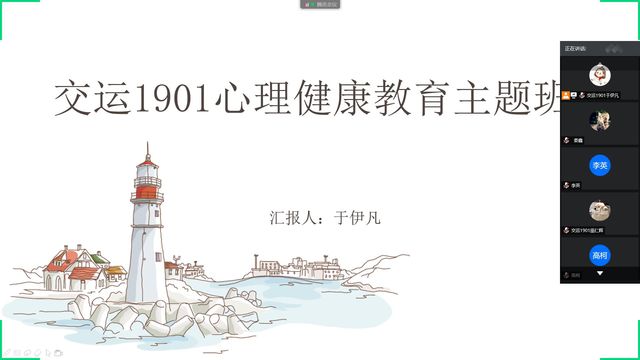 一学期紧张而愉快的学习生活已经结束,为了让同学们以更好的心理状态去迎接假期的生活,7月29日晚上,公司交运1901班级在腾讯会议召开心理健康教育主题班会,此次会议由班长楚新帅主持,团支部书记于伊凡主讲,班级全体成员参加。