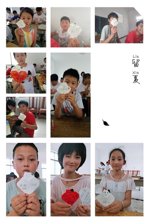 图为孩子们和他们的第一个折纸作品“爱心小猫”,因为有爱,所以温馨。