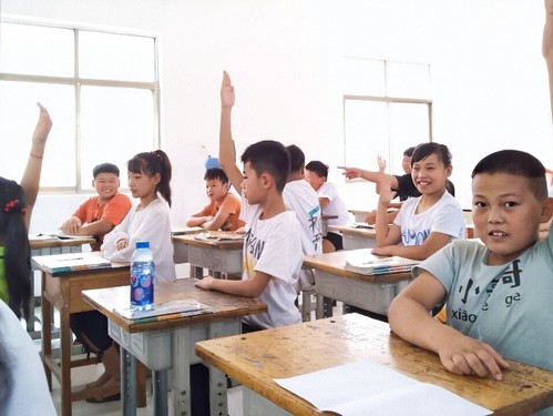 图为志愿者们组织班长竞选活动,孩子们积极踊跃参与。