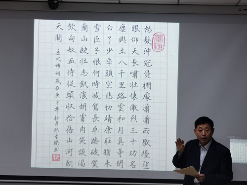 经过评委老师们的研究讨论,对作品进行打分后,徐启达率先发言,向在场的同学阐释了一幅好的书法作品所应注意的细节,强调了传承中华民族书法文化的意义,表达了对同学们提高书法水平的殷切期望。