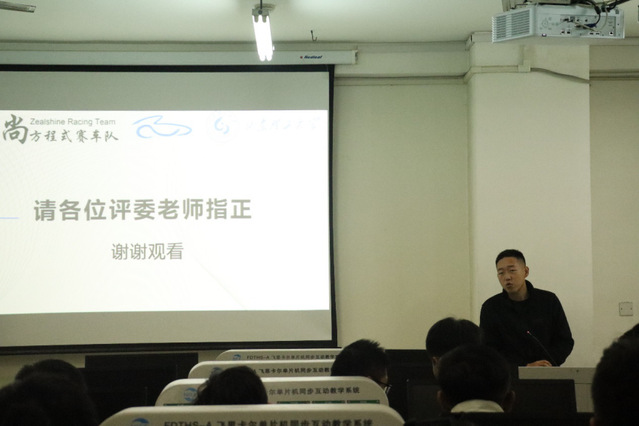 接下来,技术组各组队员分别介绍了本组的样车工作安排和设计思路。动力总成系统队员介绍了油箱位置·排气系统和机油泵;电控系统队员介绍了样车整车电路线束建模·单片机控制换挡模块·气动换挡结构和档位显示器及接线方式;悬架系统队员介绍了传动比的优化前后对比和传动比的计算;车身系统队员介绍了车架焊接顺序;转向系统队员介绍了方向盘设计·转向柱支座和转向机的轻量化设计;制动系统队员展示了实际图·仿真图和实物图,并进行了介绍;传动系统队员介绍了条状槽和差速器的固定方式。在答辩过程中各评委指出了设计过程中需注意的问题,同时也提出了现存问题的解决建议。