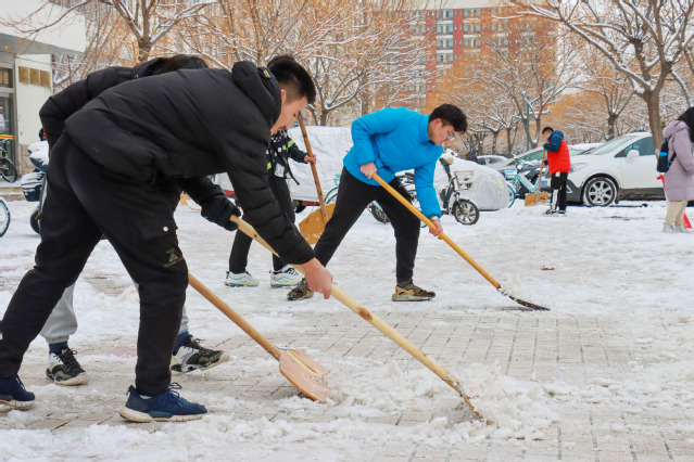 尽管寒风凛冽,积雪厚重,而且路面上的积雪都已结冰,增加了扫雪除冰的难度,同学们除雪的热情却分毫未减。员工干部和预备党员以身作则、身先士卒,将积雪铲至树根和道路两旁,并简单清理了共享单车上的积雪。大家配合默契,教学楼前的坚冰积雪逐渐被清理干净,露出了大理石瓷砖。半个多小时的扫雪活动中,同学们个个干劲十足,浑然不在意落在身上的雪花与冻得通红的双手和脸颊,大家躬着身子,铁锹,木铲、扫帚、铁锹、铁铲齐上阵,挥锹、破冰、铲雪、清地。