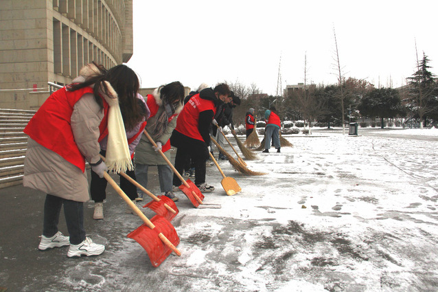 尽管寒风凛冽,积雪厚重,而且路面上的积雪都已结冰,增加了扫雪除冰的难度,同学们除雪的热情却分毫未减。同学们将积雪铲至树根和道路两旁,并简单清理了共享单车上的积雪。大家配合默契,教学楼前的坚冰积雪逐渐被清理干净,露出了大理石瓷砖。半个多小时的扫雪活动中,同学们个个干劲十足,浑然不在意落在身上的雪花与冻得通红的双手和脸颊,大家躬着身子,铁锹,木铲、扫帚、铁锹、铁铲齐上阵,挥锹、破冰、铲雪、清地。