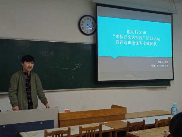 3月13日,能源与动力工程专业1901班体育委员严作兴在12号教学楼214教室组织开展“寒假归来话实践”主题团日活动暨评选优秀社会实践团队,能动1901全体同学参加。