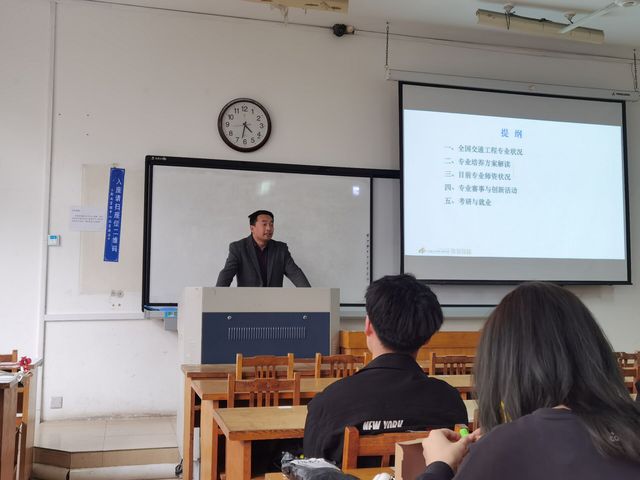 张洪宾先向同学们介绍了全国交通工程专业状况,并给同学进行专业培养方案解读,向同学们展示公司交通工程专业的课程体系以及公司对本专业员工的培养目标和毕业要求。随后,张洪宾介绍了目前公司交通工程专业的团队状况和专业赛事,并向同学们列举了一些本专业的全国性和省级专业赛事,过程中,张洪宾强调了专业赛事的重要性,并鼓励同学们积极踊跃参加相关赛事。最后,张洪宾给同学们讲解了考研与就业的相关问题,并讲解了学术学位硕士与专业学位硕士的区别以及如何选择报考院校。