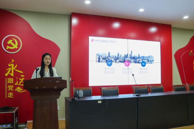 会议主要分为马克思主义公司时政宣代表经验分享、公司党史学习宣讲团细则(试行)讲解两部分。首先由马克思主义公司时政宣团代表管雅倩从选题、切入点以及时政热点等方面应注意的问题进行讲解。随后,由时政宣讲团代表牛婷娴从PPT制作以及宣讲过程中需要注意的问题进行经验分享。